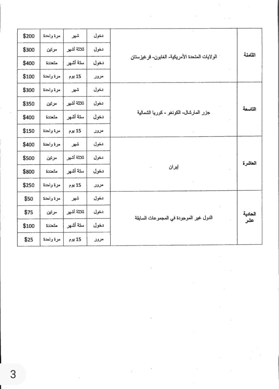 - الدول غير المذكورة: بالنسبة للدول التي لم تُذكر بشكل صريح ضمن المجموعات المحددة في القرار، سيكون رسم الدخول إلى الأراضي السورية 50 دولارًا، لمدة صلاحية شهر واحد ودخول لمرة واحدة فقط.