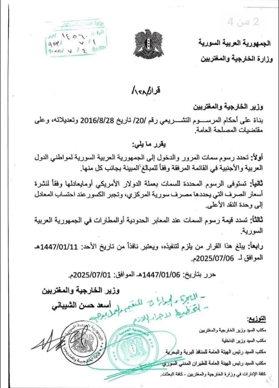 أصدر وزير الخارجية والمغتربين السوري، أسعد الشيباني، قراراً يقضي بتحديد رسوم جديدة لسمات المرور والدخول إلى سوريا لمواطني الدول العربية والأجنبية، إذ يدخل هذا القرار حيز التنفيذ اعتبارًا من يوم غد الأحد الموافق 6 من تموز الجاري.