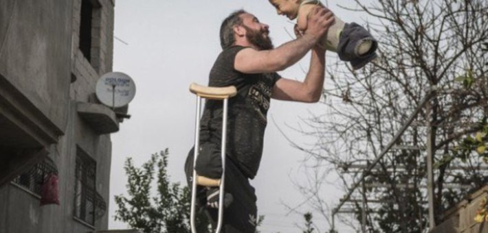 فازت صورة مؤلمة لأب سوري بساق واحدة ويحمل طفله المولود بدون أطراف سفلية أو علوية، ج بصورة العام لجوائز سيينا الدولية للصور لعام 2021.