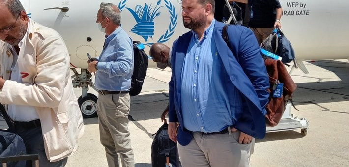 ونشر مكتب تنسيق الشؤون الإنسانية (أوتشا) في سوريا، صورا لدان ستوينسكو مع عمران رضا، قرب طائرة تابعة للأمم المتحدة في مطار حلب.