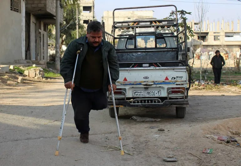 وبعد أن فقد ساقه، اضطر أبو محمد إلى إعادة ترتيب حياته من جديد، فقام بتعديل شاحنة صغيرة لتتناسب مع إعاقته، وأضاف ناقل حركة يدويا، وهو يعمل سائق توصيل الآن. وأبو محمد واحد من ضحايا كثيرين للذخائر المتفجرة في سوريا.