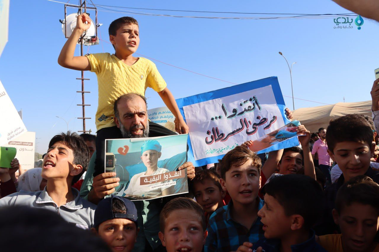 ونظم الاعتصام ناشطون إعلاميون وإنسانيون في شمال سوريا، في 21 يوليو الجاري، كما شاركهم مرضى السرطان داخل خيام بهدف مطالبة الجانب التركي والدول الأوربية والأمم المتحدة إدخالهم للمشافي للحصول على العلاج الشعاعي والجرع الكيماوية.