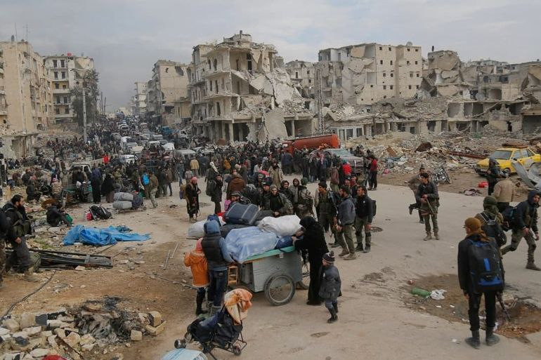 ودمرت القوات الروسية مدينة حلب، التي كانت معقل المقاومة، وتسببت في نزوح 6.8 مليون لاجئ سوري إلى البلدان المجاورة والبلدان المجاورة للاتحاد الأوروبي، وشردت 6.7 مليون مدني إضافي داخل سوريا.